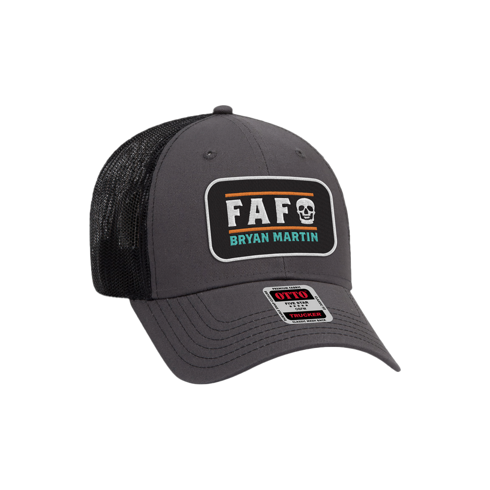 Gray trucker hat with the F.A.F.O. x Bryan Martin patch on the front