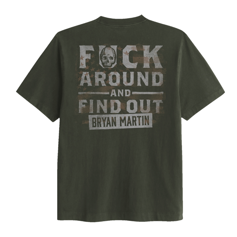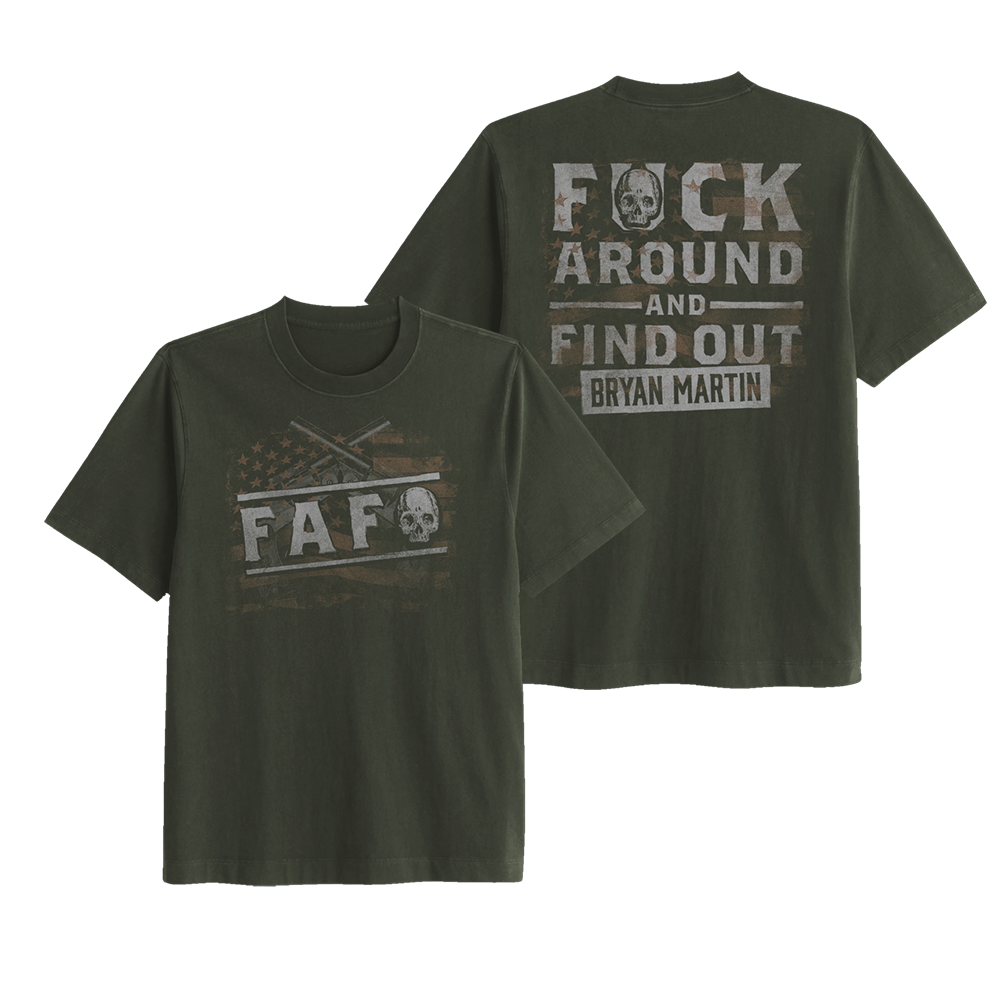 Sage green t-shirt with the F.A.F.O. design printed on the front and phrase on the back